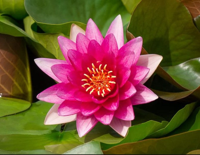 Nymphaea 'Escarboucle' is a hardy water lily celebrated for its large, fragrant, deep-red to vermilion flowers with bright orange stamens, sometimes tipped in white. Blooming from early summer to autumn, it produces free-flowering 15–20 cm blooms that stay open longer into the evening. Its rounded mid-green leaves create a floating canopy that provides shade and habitat for pond life. This striking lily thrives in full sun and still water.
